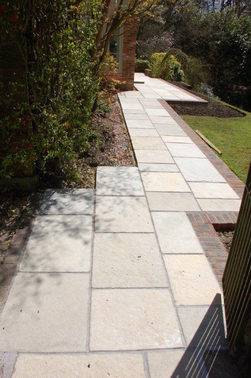 The limestone was delivered in smaller vehicles (as requested) so we could get the stone close to our house and was in well-packed small pallets which were easier to move and select from. The area surrounding the new orangery and down to the garden steps is perfect and blends in well with both garden and new build.