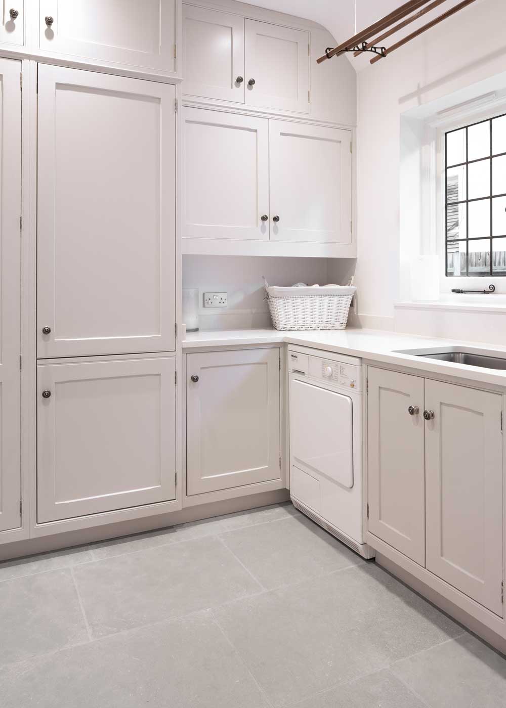 Neutral tones have been used throughout this homely kitchen which features our pale grey stone floor – Chalon grey limestone.