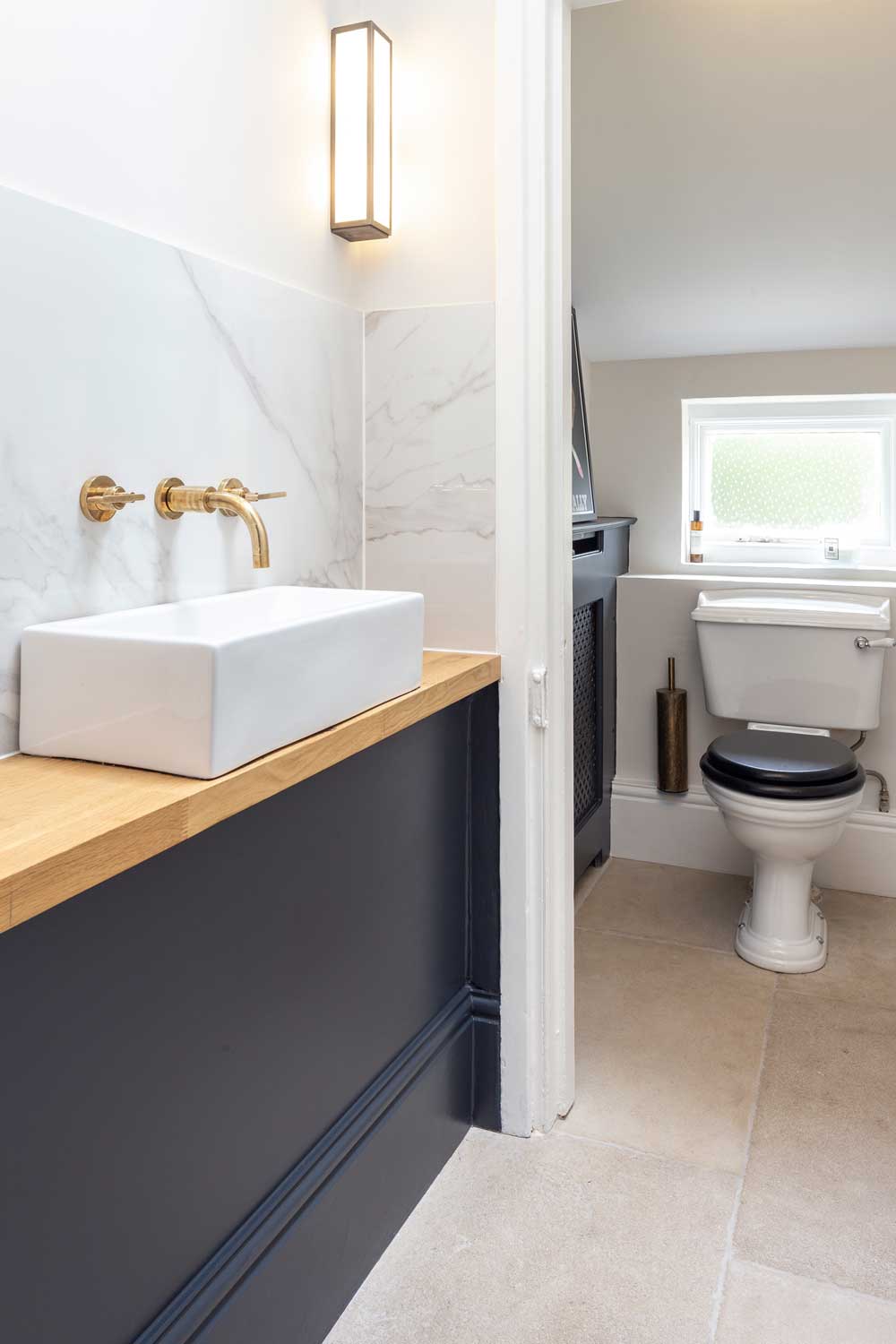 The stone floor also continues into the cloakroom where unlacquered brass taps from Studio Ore have been used to create a sense of luxury.