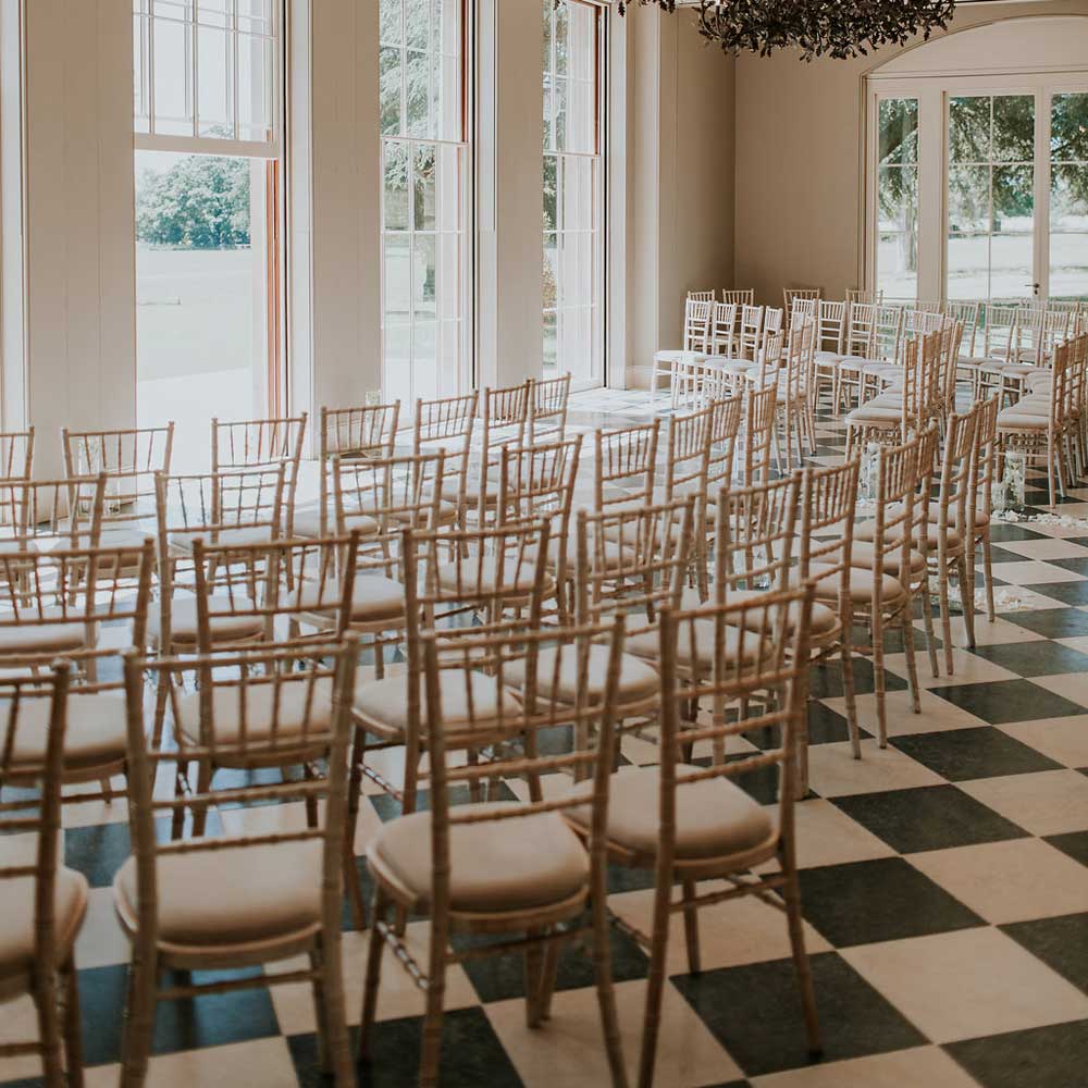 A checkered stone floor featuring Belgian blue stone was used to create a space filled with elegance at this luxury country wedding venue.