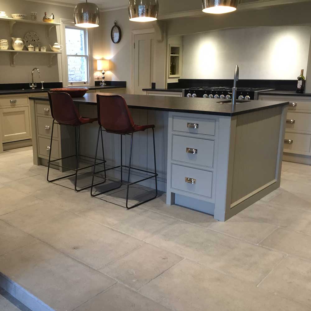 Chalon Grey limestone was used throughout this large kitchen/diner and contrasts lovingly against the dark blue and off-white kitchen cabinets to create a warm, contemporary room perfect for socialising as well as busy family life.
