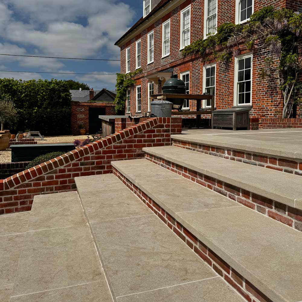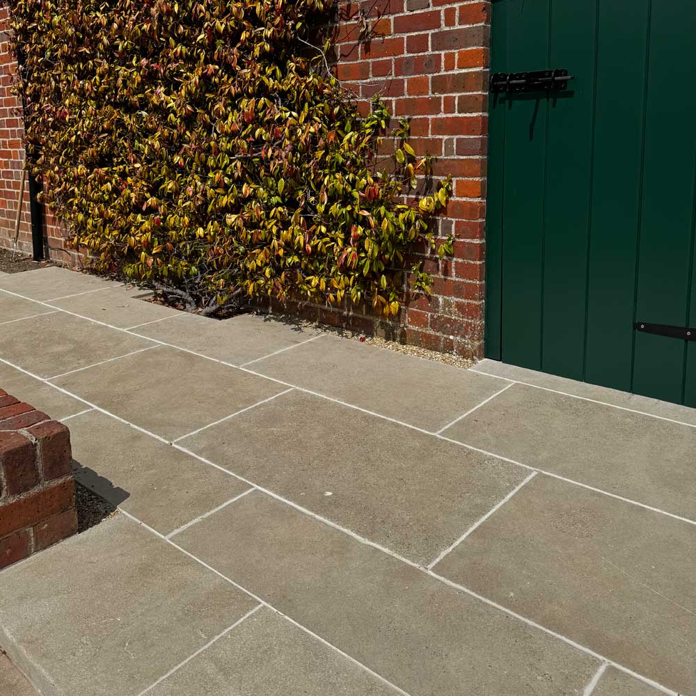 Bourton buff limestone paving: A consistent buff paving material with softly aged edges and a slightly textured surface – the ageing and pitting to the surface varies from piece to piece. Supplied in a random lengths format, these stones can also be used inside to create a flow between two spaces. Complementary swimming pool copings, step pieces and wall copings are also available in this material.
