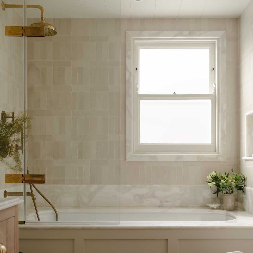 White Bejmat tiles: White Moroccan Bejmat tiles with a rich icing-like glaze over the surface and edge with glimpses of warm terracotta tones beneath.  Bejmat tiles can be laid in a number of formats including brick bond, herringbone, double herringbone and more. Due to their hand-made and rustic nature, each piece will vary in colour tone and sizes are approximate – these are all characteristics that make up the charm of these tiles.